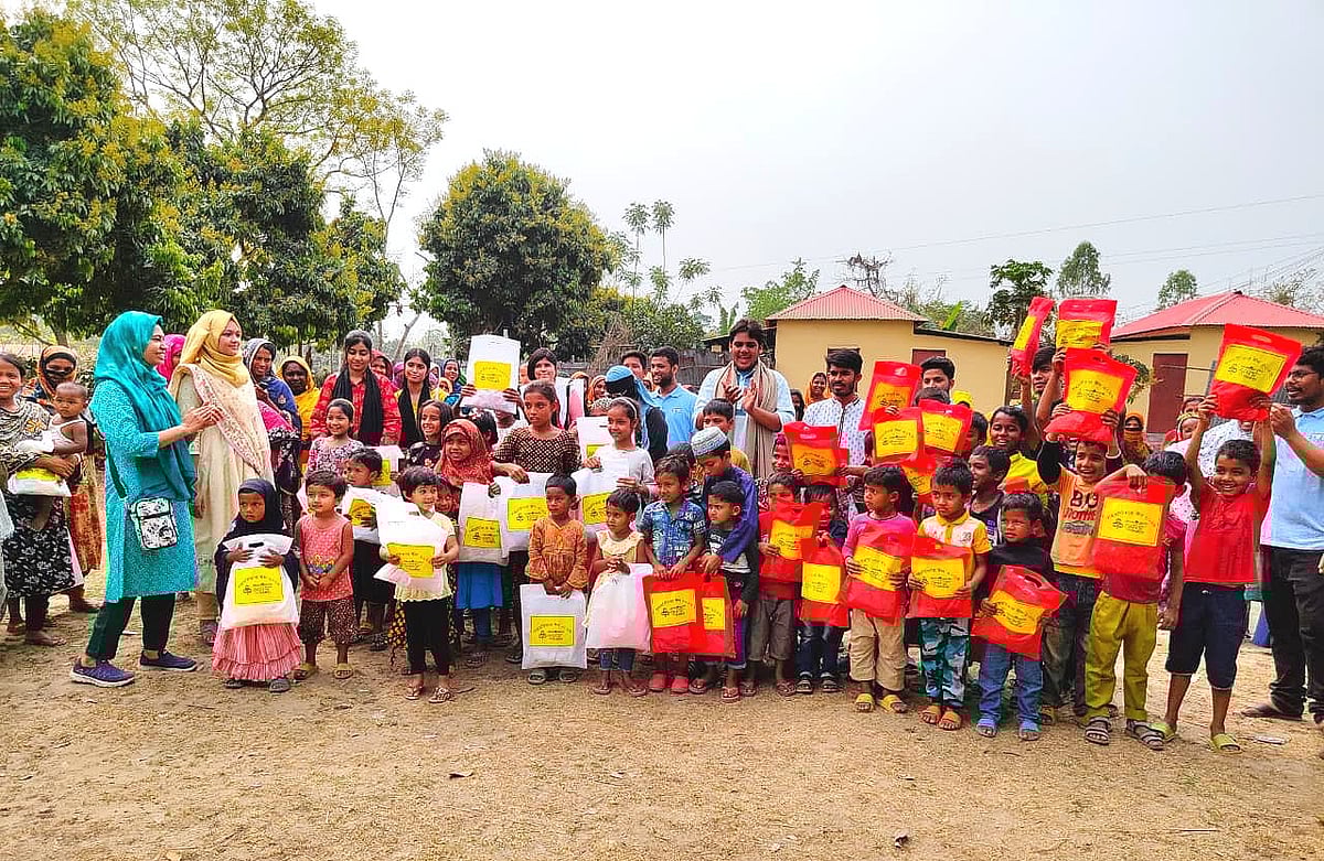 মাঠের মধ্যে দুই সারিতে দাঁড়ানো শিশুরা। তাদের কারও বয়স দুই বছর, কারও বয়স দশ। পাশে কয়েকটি সারিতে মায়েরাও দাঁড়িয়েছেন। কয়েকজন অশীতিপর বৃদ্ধাকে দেখা গেল। সঙ্গে রয়েছে প্রথম আলো দিনাজপুর বন্ধুসভার বন্ধুরা। বন্ধুদের হাতে শিশুদের জন্য রঙিন জামার প্যাকেট। আর তাদের মায়েদের জন্য চাল-ডাল-তেল-সেমাই-চিনি-দুধের প্যাকেট। কিছুক্ষণের মধ্যে শুরু হলো বিতরণ। জামা হাতে পেয়েই শিশুদের ছোটাছুটি, হইহুল্লোড়।
